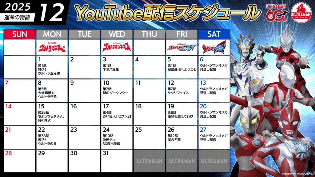 ウルトラマンシリーズ60周年プロジェクトとして、ウルトラマンシリーズ作品の厳選エピソードをYouTubeで毎月無料配信しています。