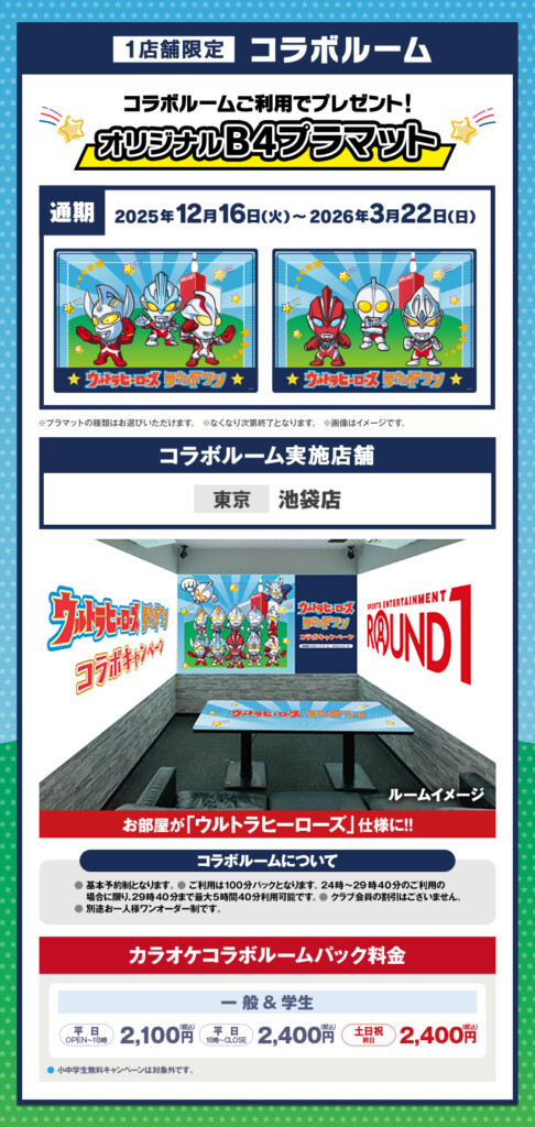 ボウリング・カラオケ・スポッチャ・ビリヤード・ダーツでは、ウルトラヒーローのオリジナルB4プラマットがもらえるコラボパックが販売されます。