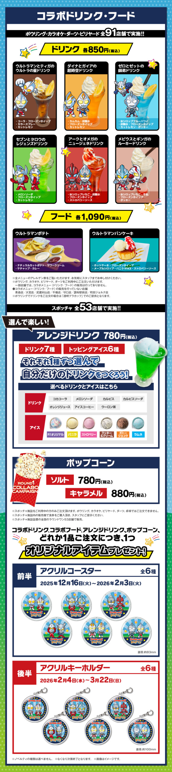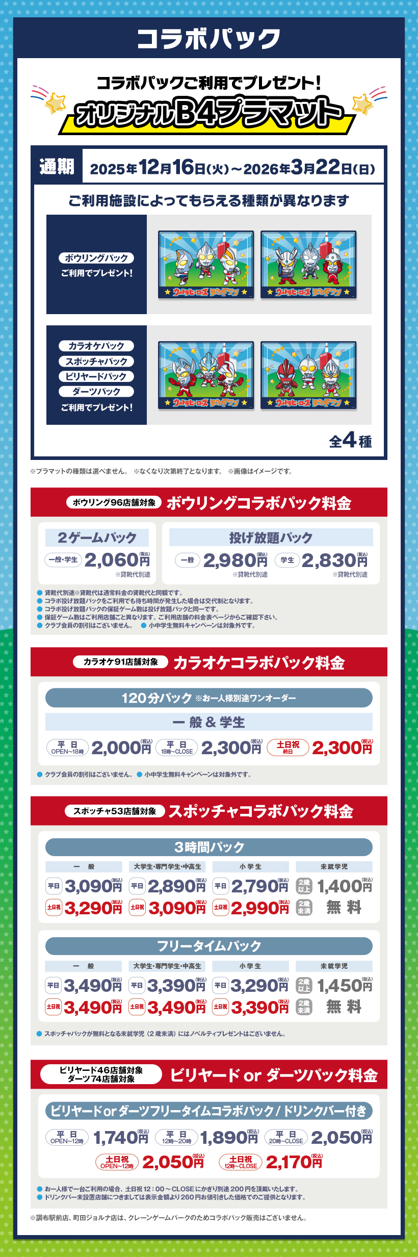 ボウリング・カラオケ・スポッチャ・ビリヤード・ダーツでは、ウルトラヒーローのオリジナルB4プラマットがもらえるコラボパックが販売されます。